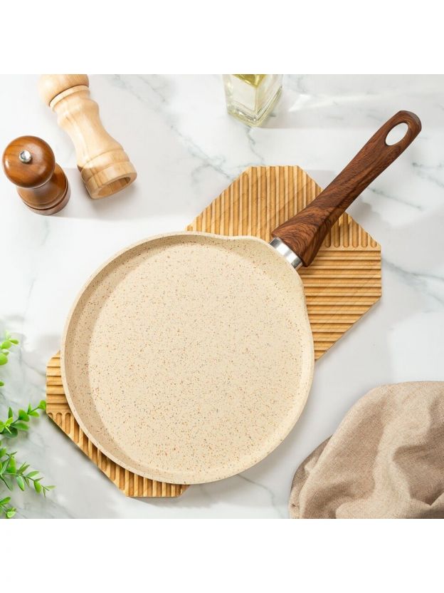 Блинница совместима с различными типами плит, включая газовые, индукционные, стеклокерамические и электрические, что делает ее универсальным инструментом для любой кухни. Пластиковая ручка не нагревается, обеспечивая комфорт и безопасность во время использования. Толщина дна в 3.2 мм способствует долговечности изделия и его устойчивости к деформации.