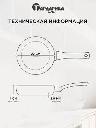 - Оптимальный диаметр 22 см, толщина дна 2.9 мм, съемная ненагревающаяся ручка из дерева.