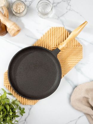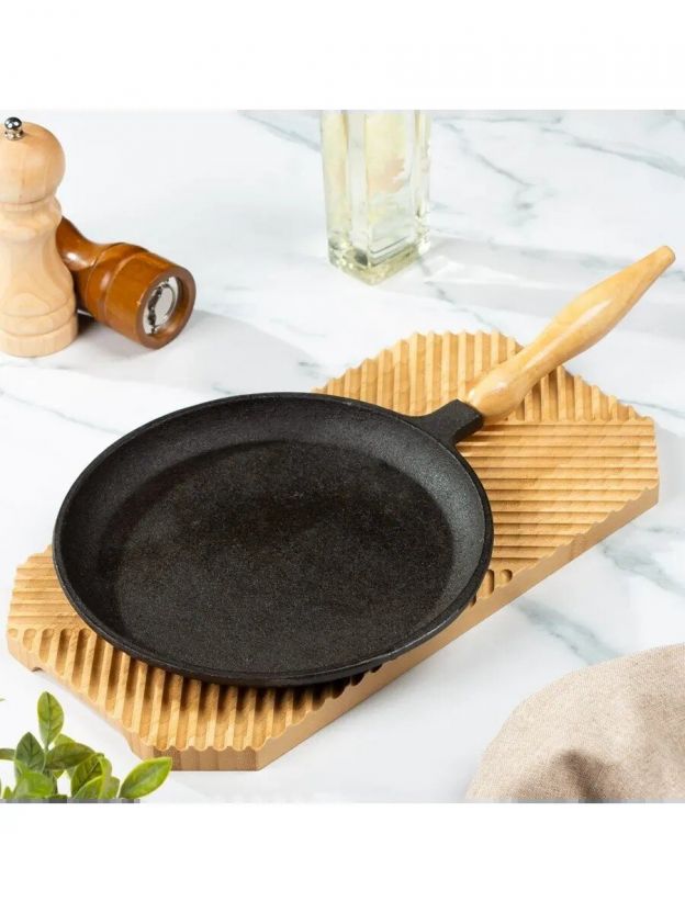Чугунная блинница диаметром 22 см из коллекции Гурман DavrMetall — это надежность и долговечность. Чугун известен своими превосходными теплопроводными свойствами, что позволяет равномерно распределять тепло по всей поверхности. Это обеспечивает идеальное прожаривание и золотистую корочку каждого блина. Деревянная ненагревающаяся ручка добавляет комфорта в использовании, а съемная конструкция позволяет легко хранить и мыть блинницу, экономя место на кухне.