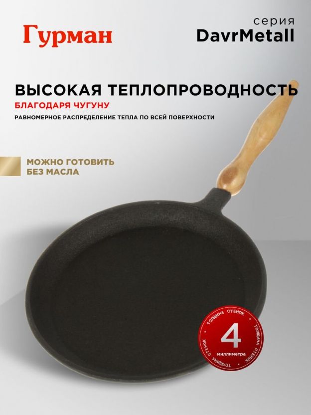 Познакомьтесь с незаменимой помощницей на вашей кухне — блинницей из чугуна диаметром 24 см от бренда Гурман, модель DavrMetall. Это идеальный выбор для тех, кто ценит качество и долговечность. Благодаря своему материалу, чугунная блинница обеспечивает равномерное распределение тепла, что позволяет готовить блины с идеальной текстурой и золотистой корочкой.