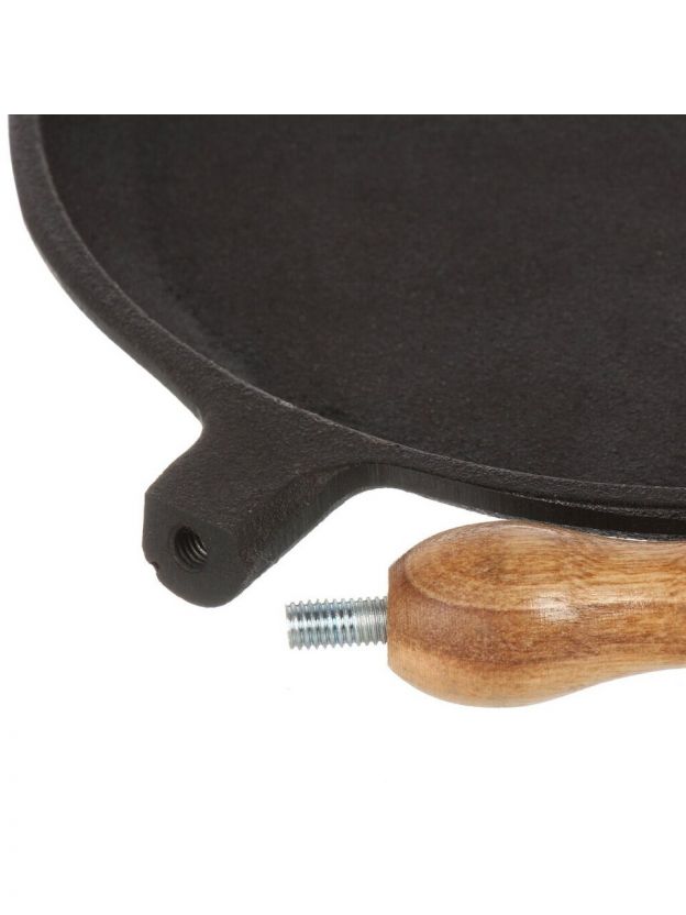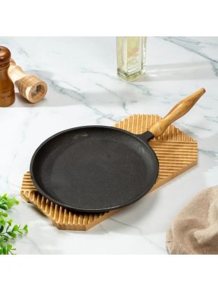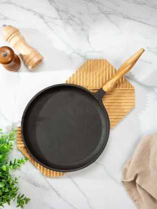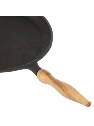 Блинница выполнена в стильном черном цвете, который идеально впишется в интерьер любой кухни. Деревянная ручка не только придает изделию особый шарм, но и обладает важной функциональной особенностью: она не нагревается. Кроме того, съемная ручка позволяет компактно хранить блинницу и использовать ее в духовке. Это делает процесс приготовления еще более удобным и безопасным.