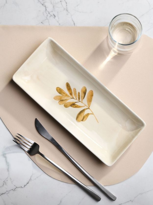 Размер 28x12 см, форма прямоугольная, с бортиками. Цвет бежевый с рисунком, количество в наборе — 1 шт.