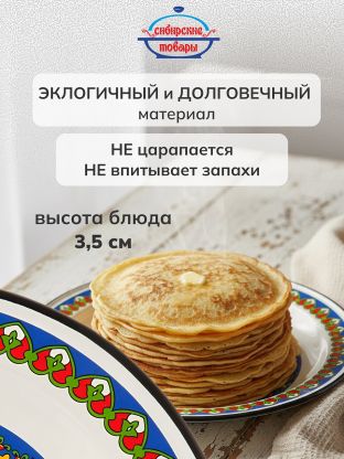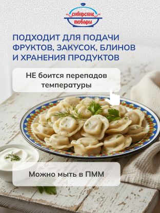 - Оптимальный размер: диаметр 35.5 см, объём 2 л, высота 3.5 см — удобно для фруктов, блинов, закусок, нарезки.