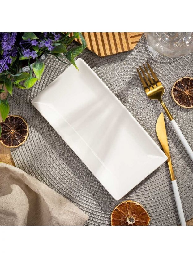 Длина блюда — 20 см, форма прямоугольная. Подходит для подачи закусок, фруктов, сыра, нарезки и сервировки на праздники.