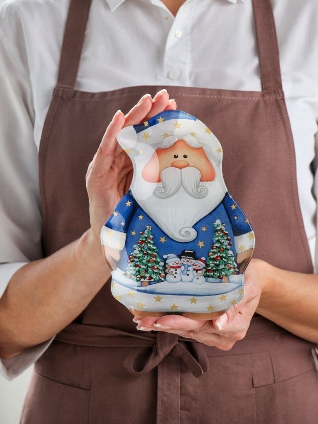 Фигурное стеклянное блюдо Daniks с Дедом Морозом — оптимальный вариант для праздничной сервировки: компактный размер (14.2х19.1 см), прочное стекло, оригинальный дизайн.