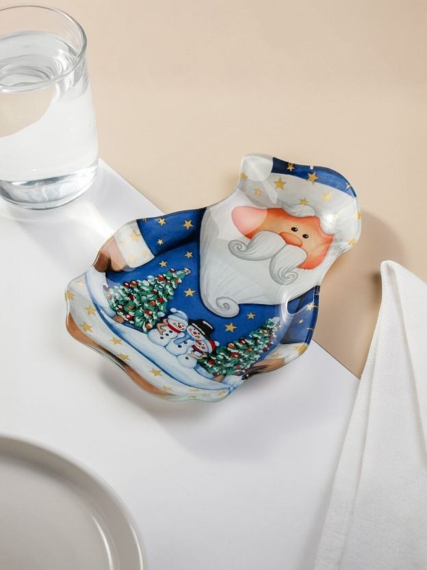 В отличие от обычных стеклянных блюд, эта модель с фигурной формой и рисунком Деда Мороза сразу привлекает внимание гостей и добавляет уюта. Многие спрашивают, подходит ли оно для ежедневного использования — стекло устойчиво к царапинам, легко моется, не впитывает запахи. Такой аксессуар станет удачным выбором для сервировки на праздник, семейных ужинов и тематических вечеринок. Если вы ищете, что лучше для подачи фруктов или нарезки на Новый год, это блюдо сочетает в себе декоративность и практичность.