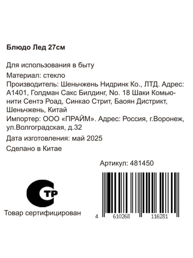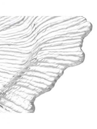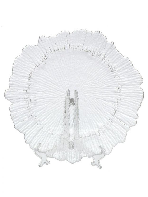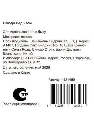 Диаметр 27 см, материал — прочное прозрачное стекло с рельефным декором «Лед», высота бортиков оптимальна для большинства закусок и салатов.