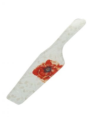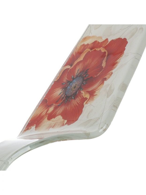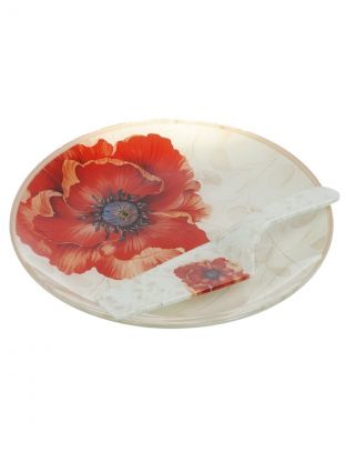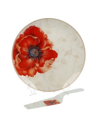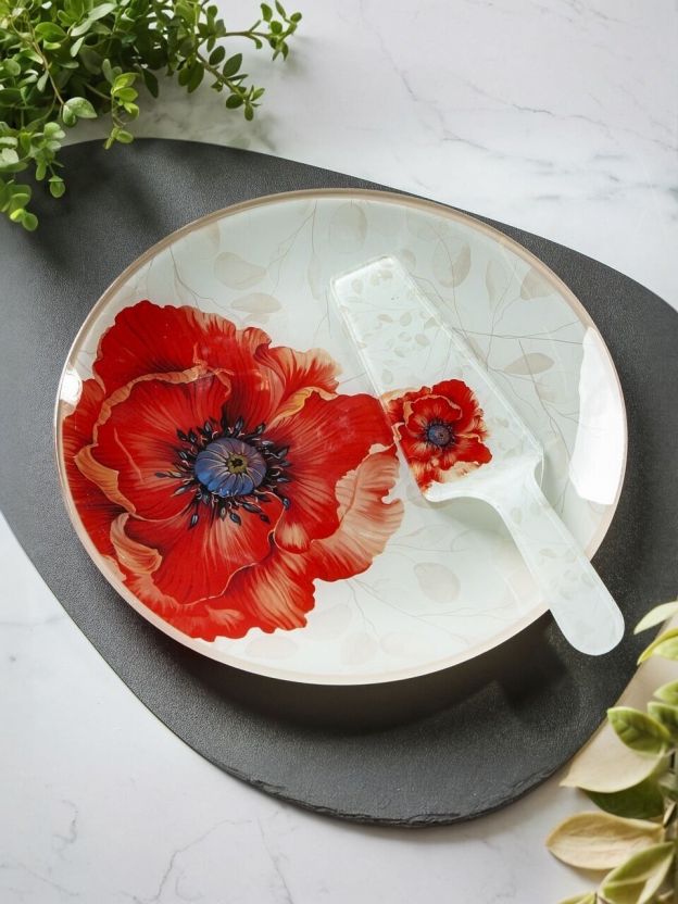 • Уникальный набор: стеклянное блюдо с ярким рисунком мака и удобная лопатка для подачи