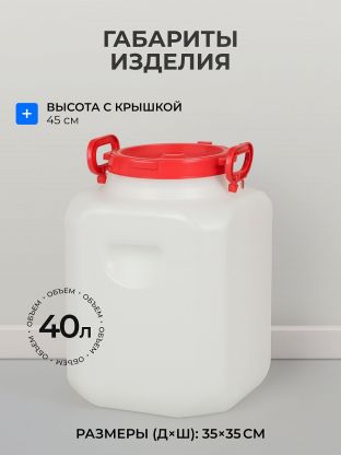 Длина — 35 см, ширина — 35 см, высота — 45 см, объём — 40 литров, диаметр горловины — 195 мм.
