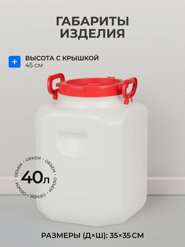 • Компактный квадратный формат: 35x35x45 см, объём 40 л, широкая горловина 195 мм — удобно наливать и мыть
