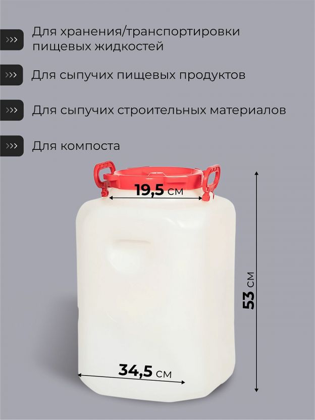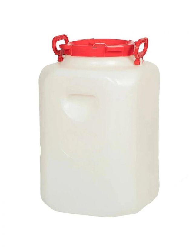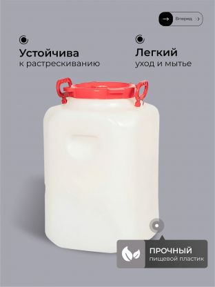 Бочка изготовлена из прочного пищевого пластика, не выделяющего вредных веществ. Белый цвет позволяет легко контролировать чистоту, подходит для хранения питьевой воды.