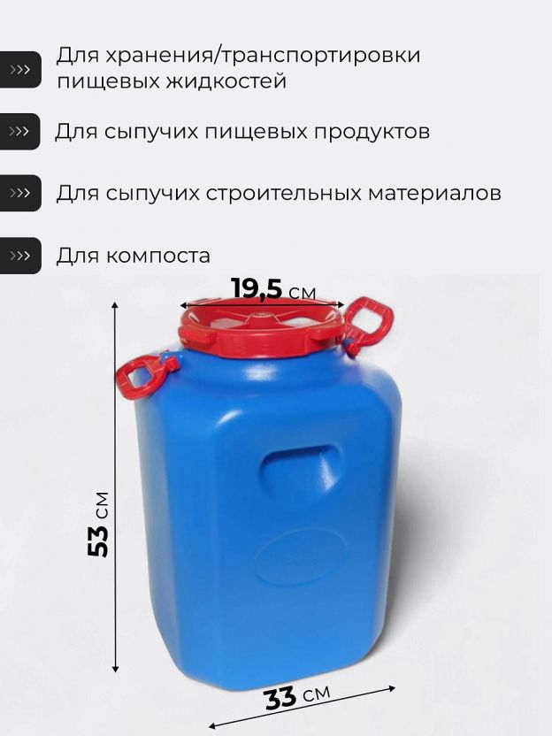 Бочка рассчитана на 50 литров, имеет размеры 33x33x53 см, диаметр горловины — 195 мм. Квадратная форма удобна для размещения в ограниченном пространстве.