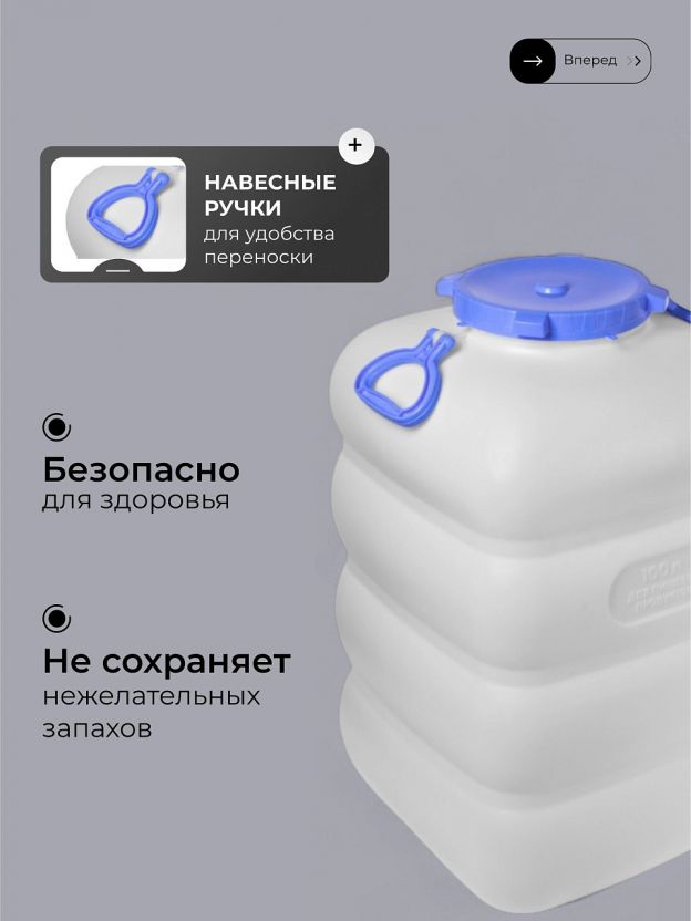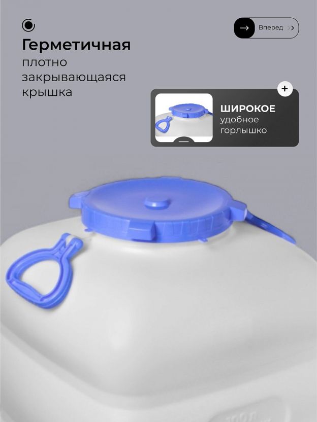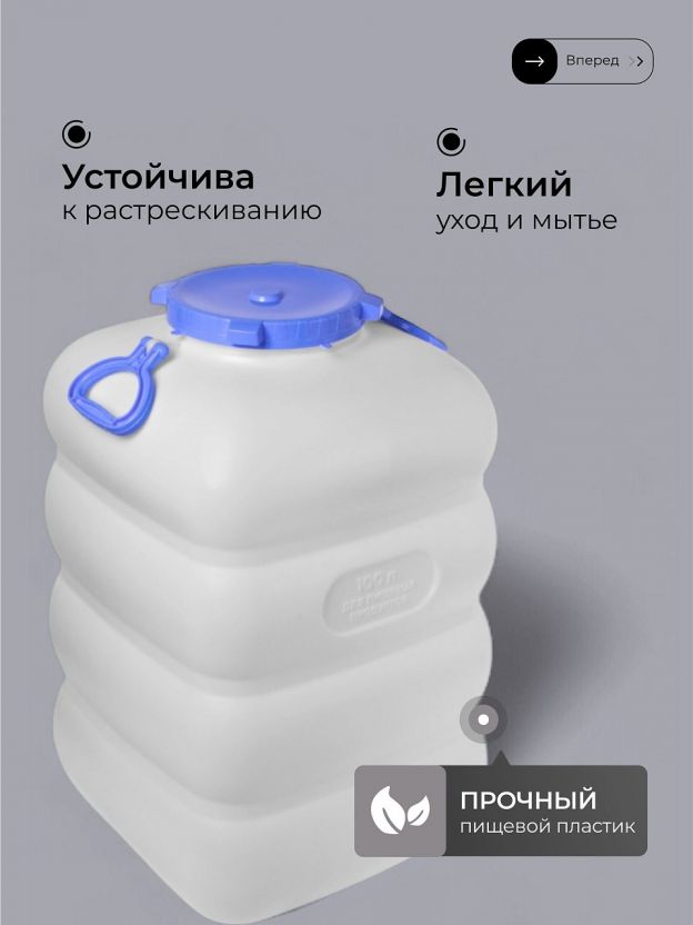 Идеальна для хранения питьевой воды, солений, овощей, круп, жидкостей и других пищевых продуктов. Можно использовать на даче, в доме, для перевозки урожая.