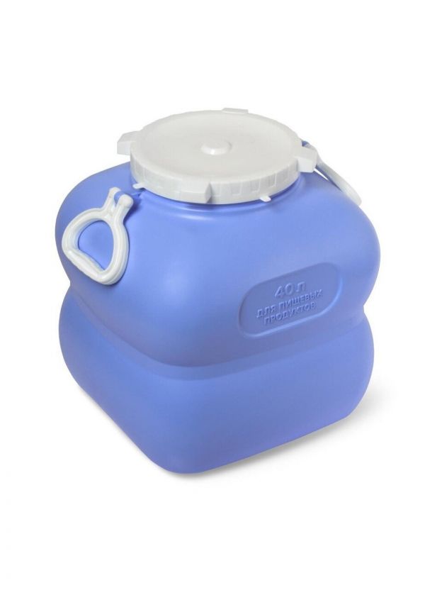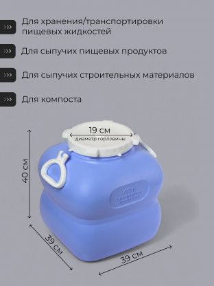 Объём — 40 литров, размеры: длина 39 см, ширина 39 см, высота 40 см, диаметр горловины 215 мм. Пищевой пластик безопасен для воды, овощей, фруктов, солений.
