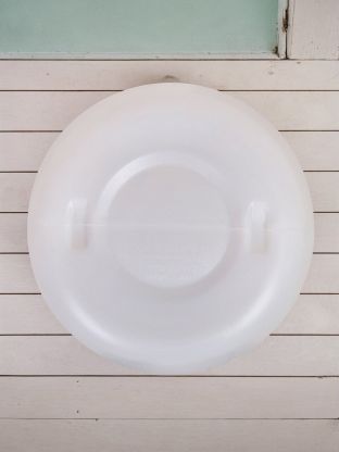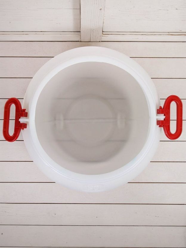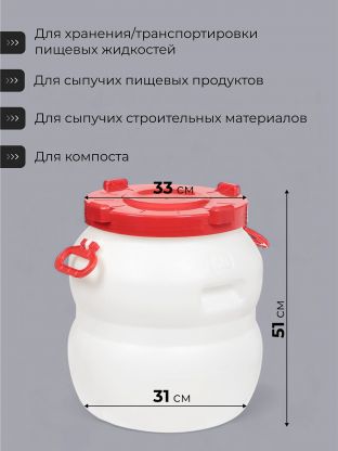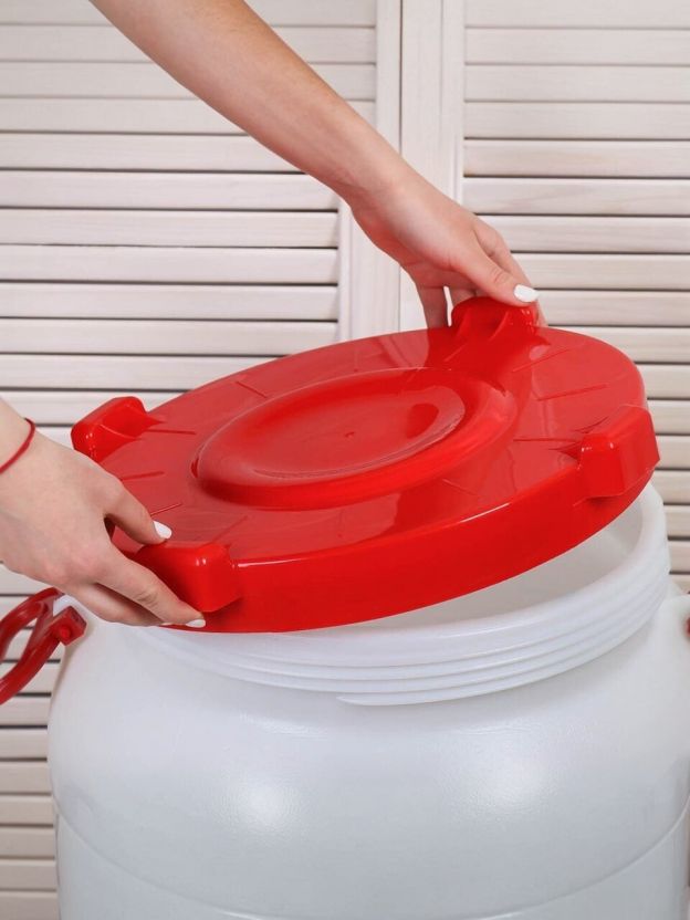 - Оптимальные параметры: объем 50 литров, диаметр горловины 330 мм, круглая форма, удобные ручки для переноски, безопасный пищевой пластик