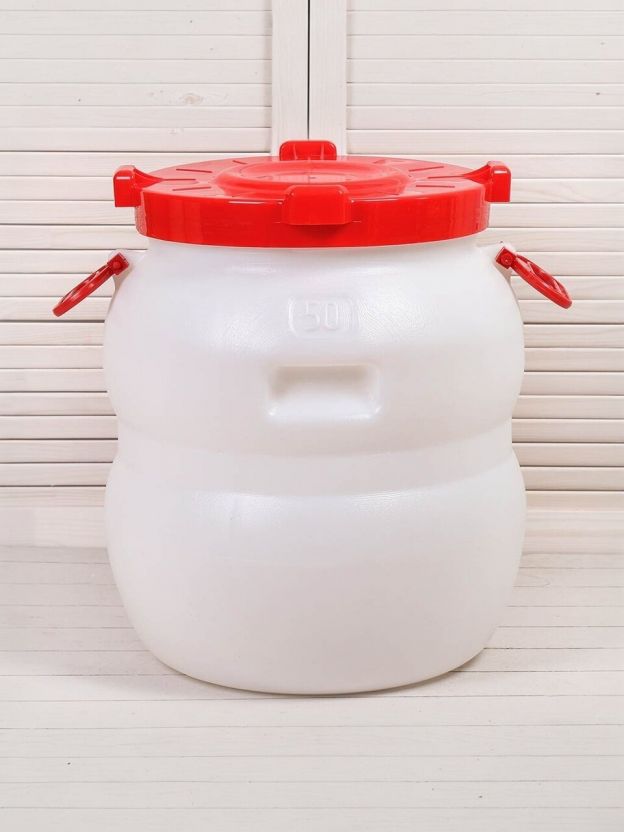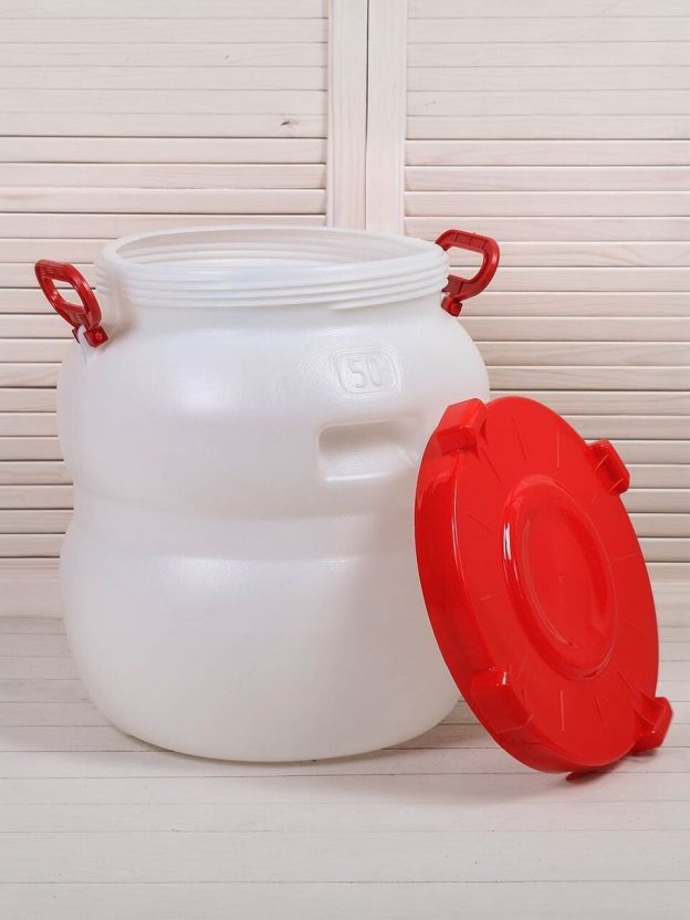 Как использовать бочку 50 литров? Она отлично подойдет для засолки овощей, хранения меда, сахара, круп, а также для транспортировки воды на даче или в хозяйстве. Удобные ручки позволяют легко переносить даже наполненную емкость.