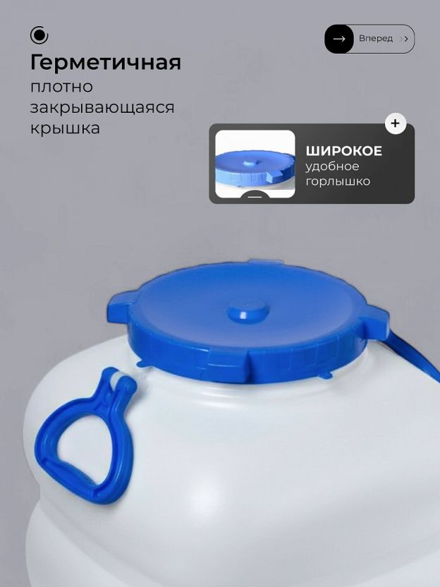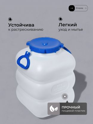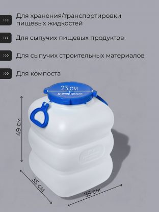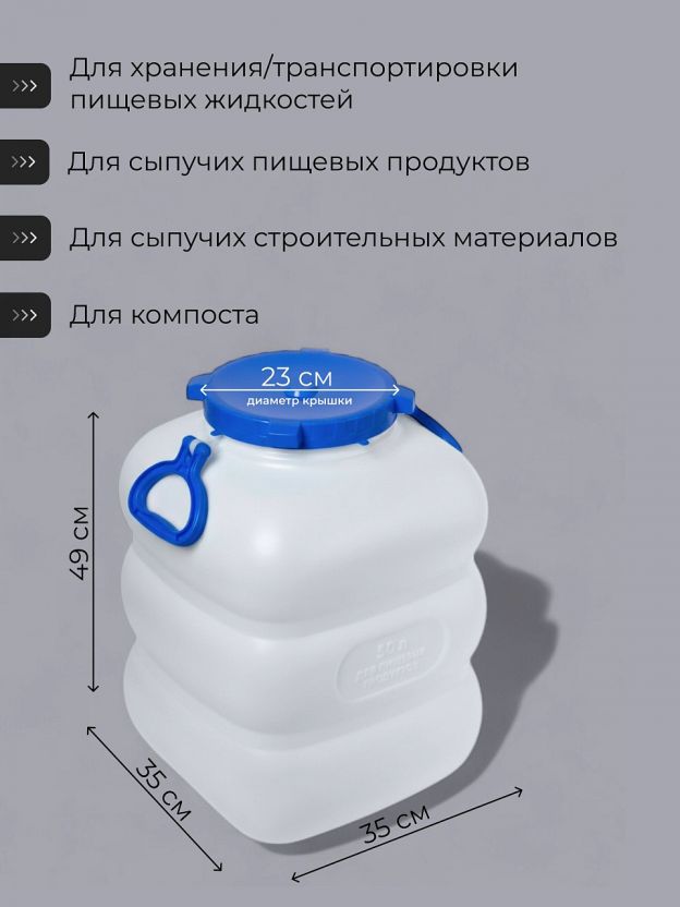 - Многофункциональность — подходит для хранения воды, солений, круп, компота, а также для сбора урожая или перевозки жидкостей на даче