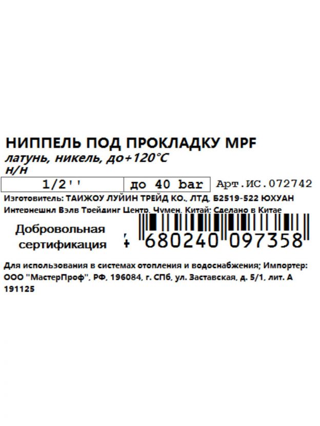 Закажите усиленный латунный ниппель 1/2" MasterProf по выгодной цене — проверьте наличие на складе и получите консультацию по монтажу. Надёжность, долговечность и универсальность — ваш выбор для дома и дачи.