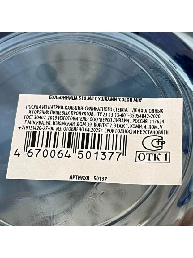 Бульонница стекло, 510 мл, с ручкой, с ушками, Color mix, 50137-12