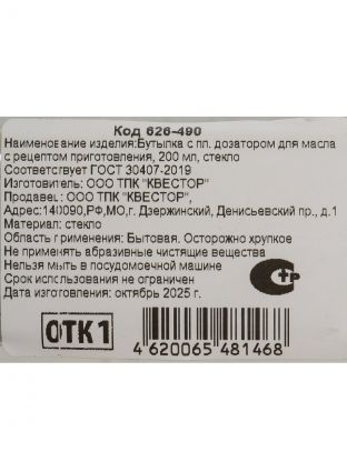Бутылка для масла, стекло, 200 мл, с пластиковым дозатором, в ассортименте, 626-490