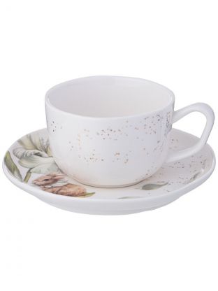 Объём чашки — 250 мл, материал — прочный фарфор с цветочным дизайном. В комплекте чашка и блюдце на одну персону.