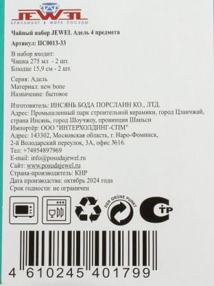 Чайная пара фарфор, 4 предмета, на 2 персоны, 275 мл, Jewel, Адель, ПС0013-33