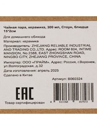 Чайная пара керамика, 2 предмета, на 1 персону, 300 мл, Стоун, блюдце 15х2 см, B060324