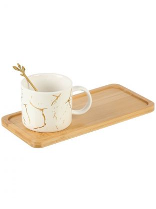 Чайная пара керамика, 3 предмета, на 1 персону, 280 мл, Мрамор, с бамбуковым блюдцем и ложкой, Y4-9001, в ассортименте
