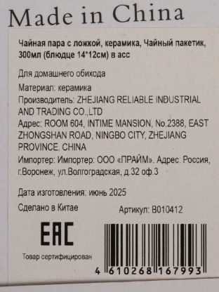 Чайная пара керамика, 3 предмета, на 1 персону, 300 мл, B010412, в ассортименте
