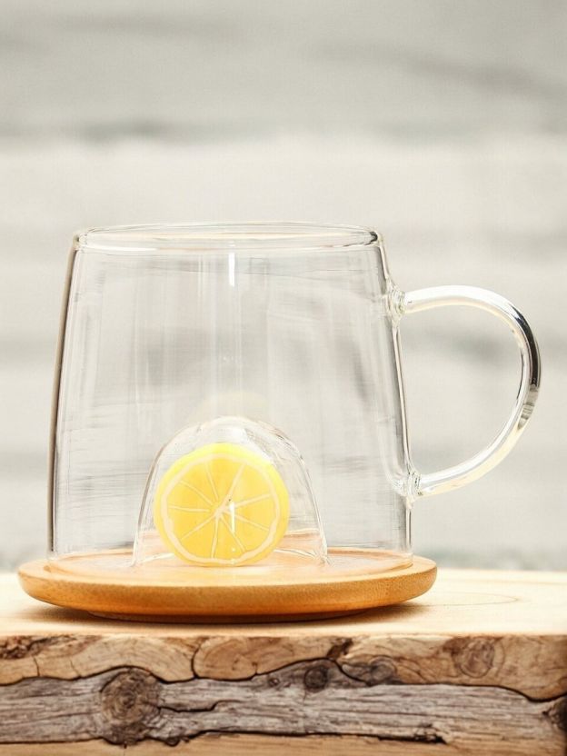 На дне кружки - углубление, созданное, чтобы бамбуковую крышку с фигуркой можно было использовать как блюдце. Фигурка точно вписывается в углубление и будто бы «плавает» в чашке, красиво просвечивая сквозь стекло.