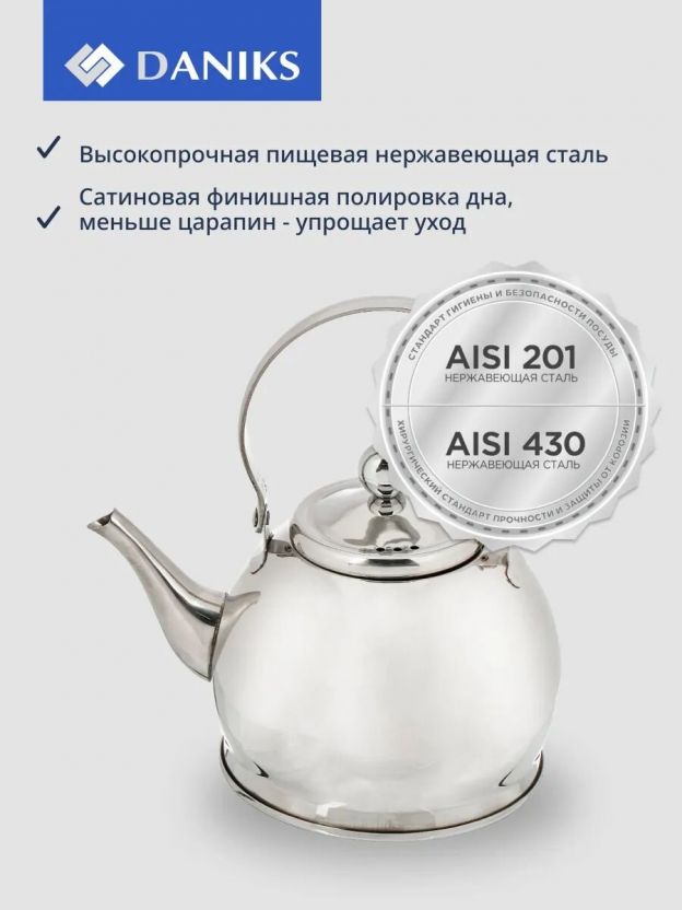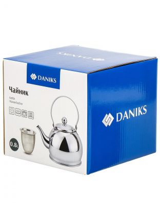 Чайник из нержавеющей стали Daniks 0.8 л — компактное решение для дома и дачи: зеркальная полировка, ситечко в комплекте, подходит для индукции и посудомоечной машины.