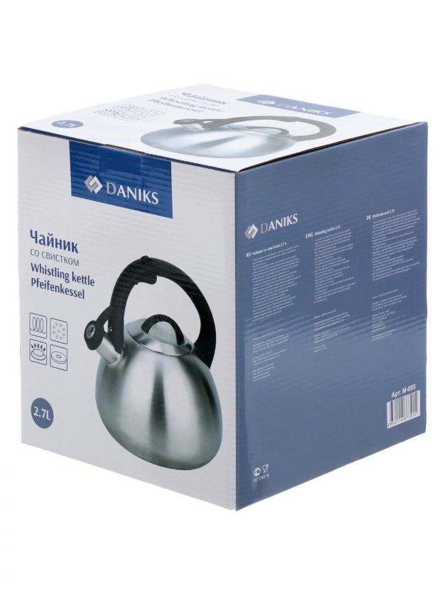 Подходит ли для подарка? Да, благодаря универсальному дизайну, прочности и гарантии 12 месяцев этот чайник станет практичным и стильным выбором для дома или дачи. Как использовать чайник Daniks? Просто налейте воду, поставьте на плиту любого типа, дождитесь сигнала свистка — и наслаждайтесь любимым напитком. Закажите чайник Daniks 2.7 л по выгодной цене — получите надёжный кухонный аксессуар с гарантией производителя.