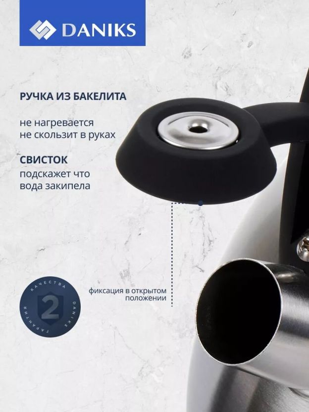 Чайник Daniks 2.7 л для индукции: стальной корпус, бакелитовая ручка с силиконовым покрытием, безопасный свисток — идеален для кухни и дачи