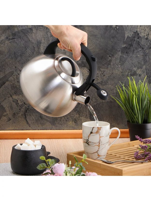 Если вы ищете, что лучше для дачи или как выбрать чайник для семьи, обратите внимание на вместимость 2.7 л — этого достаточно для 5-6 чашек чая за раз. В отличие от аналогов с эмалированным покрытием, этот чайник легче, не боится сколов и прост в уходе: можно мыть в посудомоечной машине. Свисток предупредит о закипании воды, а отсутствие фильтра в носике облегчает налив воды. Приятный матовый цвет металлик без декора гармонирует с любой кухней.