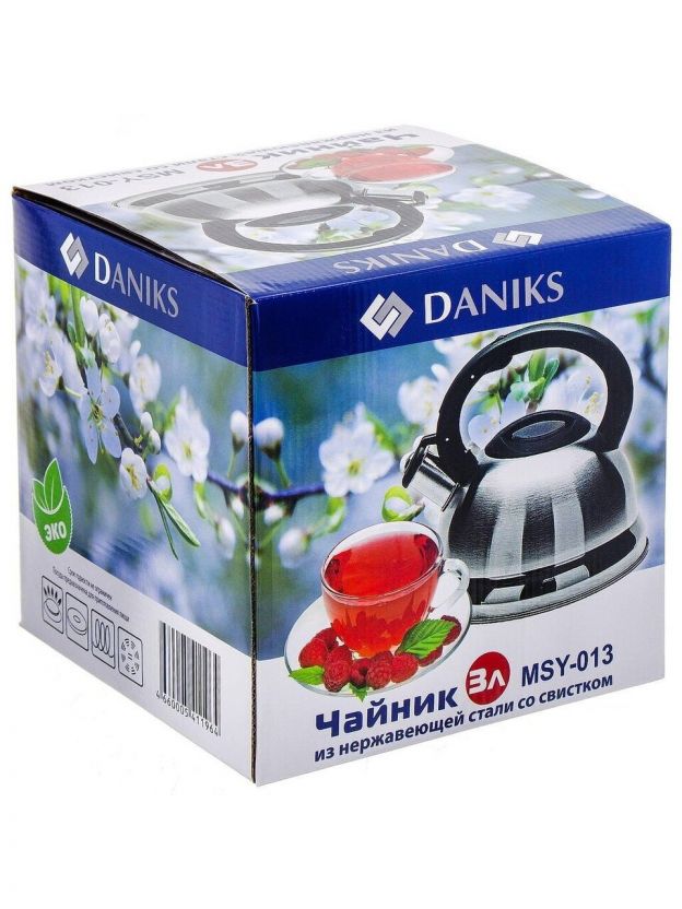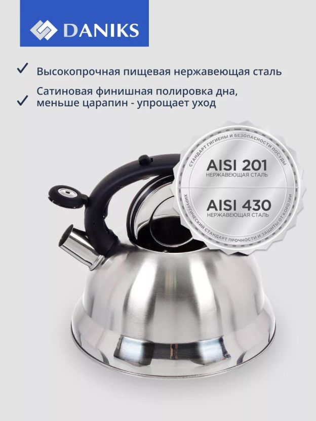 Чайник из нержавеющей стали Daniks 2.8 л — оптимальный выбор для дома и дачи: надежная конструкция, безопасная силиконовая ручка и выгодная цена.