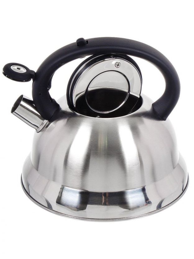 - Универсальность: подходит для газовых, электрических и стеклокерамических плит, оснащён свистком для контроля закипания