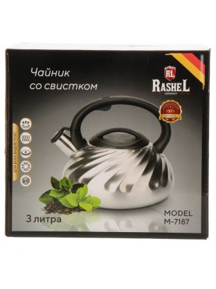 Чайник из нержавеющей стали RasheL 3 л (артикул М-7187) — это оптимальное сочетание цены и функциональности для ежедневного использования. Благодаря капсульному дну чайник быстро нагревается на газовых, электрических, стеклокерамических и индукционных плитах. Матовая поверхность устойчива к царапинам и отпечаткам, а бакелитовая ручка не нагревается, что обеспечивает комфорт даже при кипячении полного объёма воды.