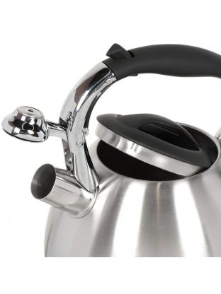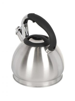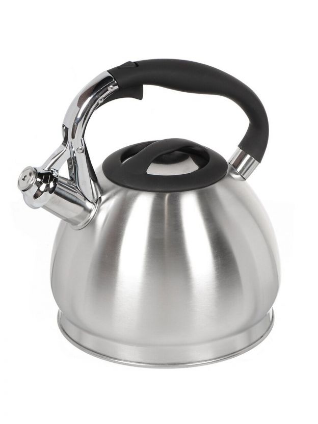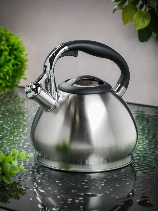 Свисток сигнализирует о закипании, что удобно для занятых пользователей. Матовая поверхность устойчива к отпечаткам, а бакелитовая ручка остаётся холодной даже при длительном кипячении.