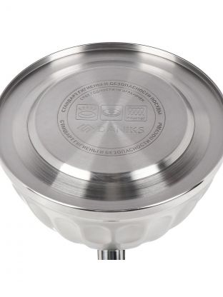 Объем — 3 литра, шаг наполнения — 0,5 л; материал корпуса — сатинированная нержавеющая сталь, ручка — бакелит, цвет — серебристый.
