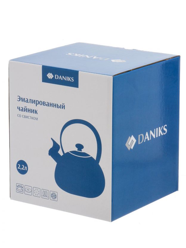 Объем — 2.2 литра, материал корпуса — эмалированная сталь с декоративным покрытием. Чайник подходит для ежедневного использования и не впитывает запахи. Рисунок с обеих сторон.