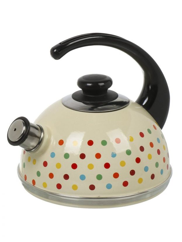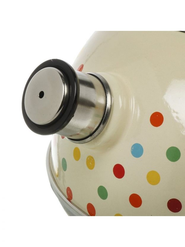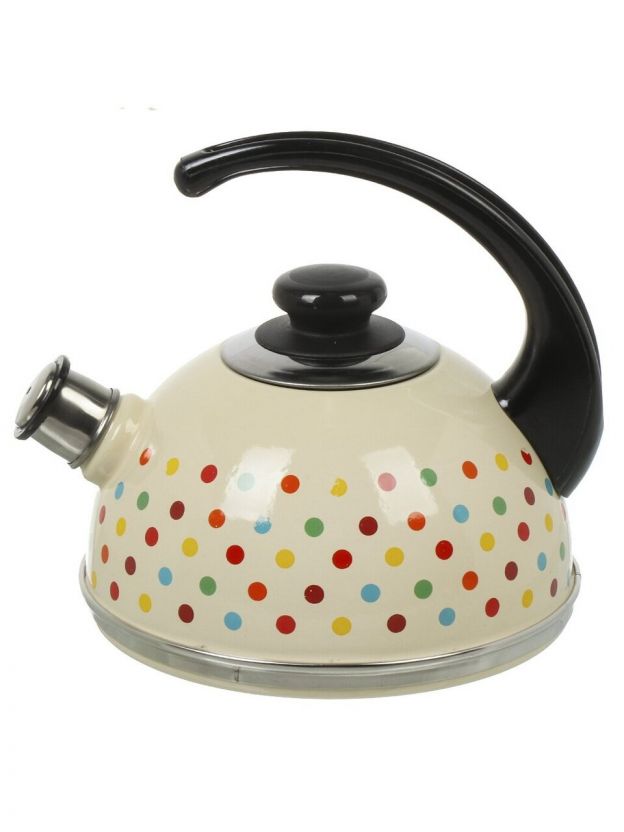 Чайник эмалированный стальной 2.5 л со свистком, ручка консольная, коллекция «Рубин Разноцветные горохи» — стиль и практичность для кухни по доступной цене.