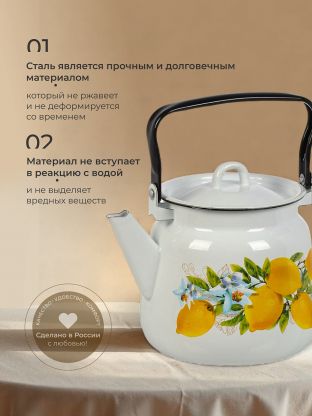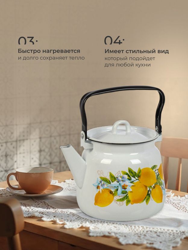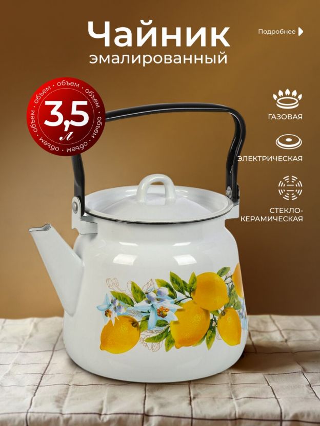Чайник стальной 3.5 л с эмалированным покрытием "Лимоны" — оптимальное решение для дома и дачи: долговечность, яркий дизайн и универсальность по выгодной цене.