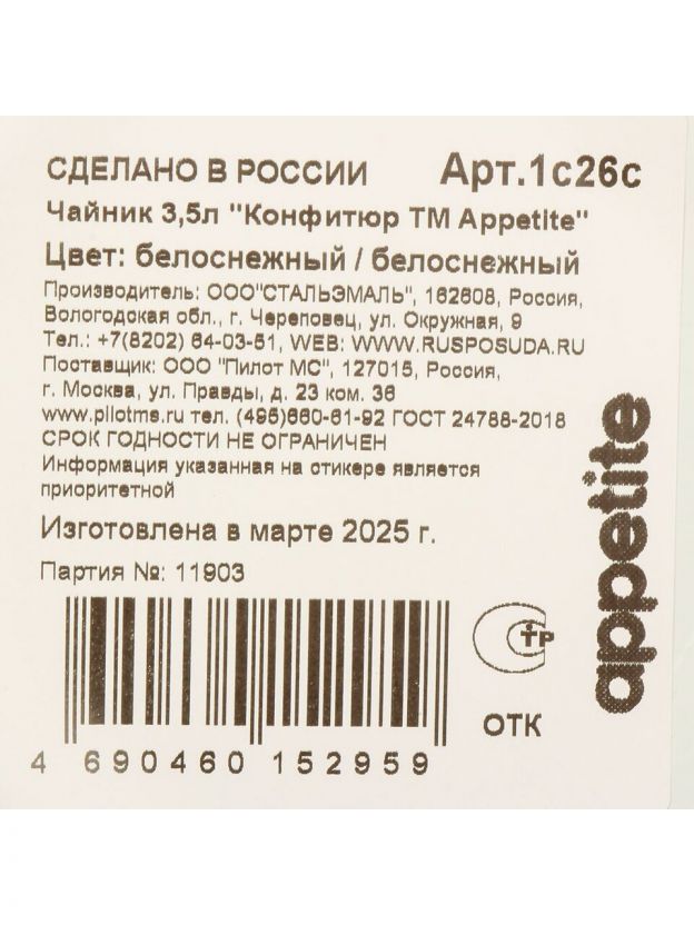Чайник Appetite Конфитюр 3,5 л: стальной корпус с эмалированным покрытием для индукции и газовых плит. Стильный декор, надёжность, легко мыть.