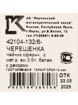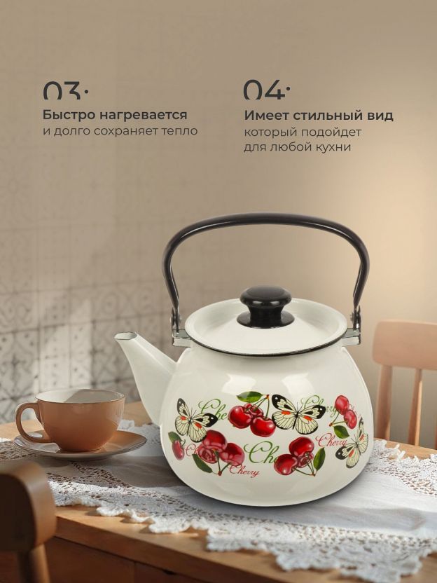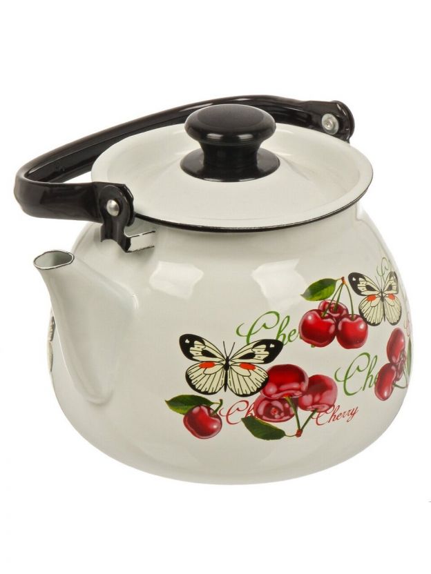 Чайник сталь, эмалированное покрытие, 3.5 л, ручка металлическая, Керченский металлургический завод, Черешенка, белый, 42104-132/6-У4