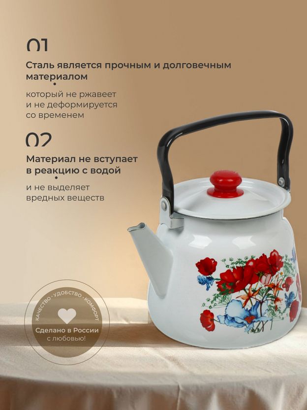 Чайник эмалированный стальной «Цветы красные» от бренда Сибирские товары — это удачный выбор для тех, кто ищет вместительный и долговечный чайник для газовых, электрических и стеклокерамических плит. Эмалированное покрытие защищает от ржавчины и облегчает чистку, а стальной корпус выдерживает ежедневное использование. Часто спрашивают, какой чайник лучше выбрать для семьи — этот объём 3,5 литра оптимален для больших компаний и чаепитий на даче.