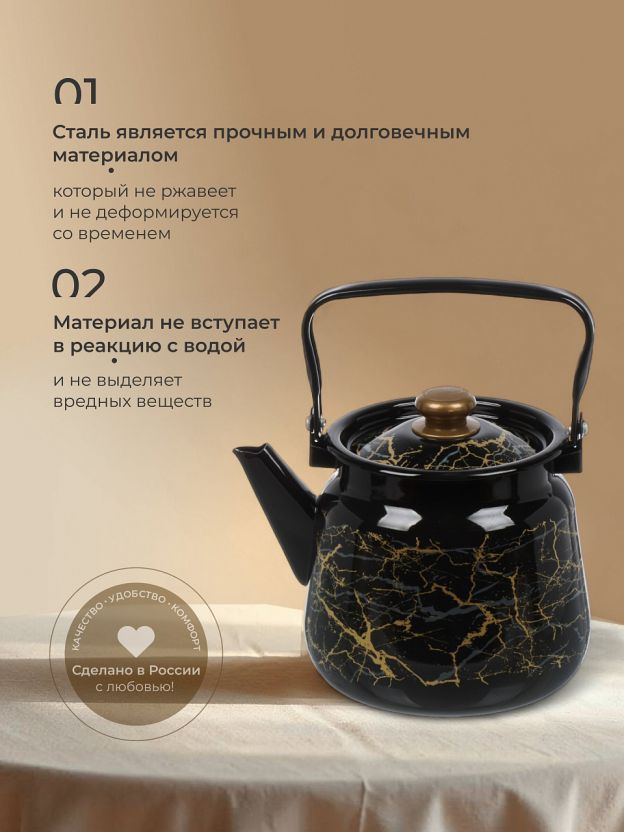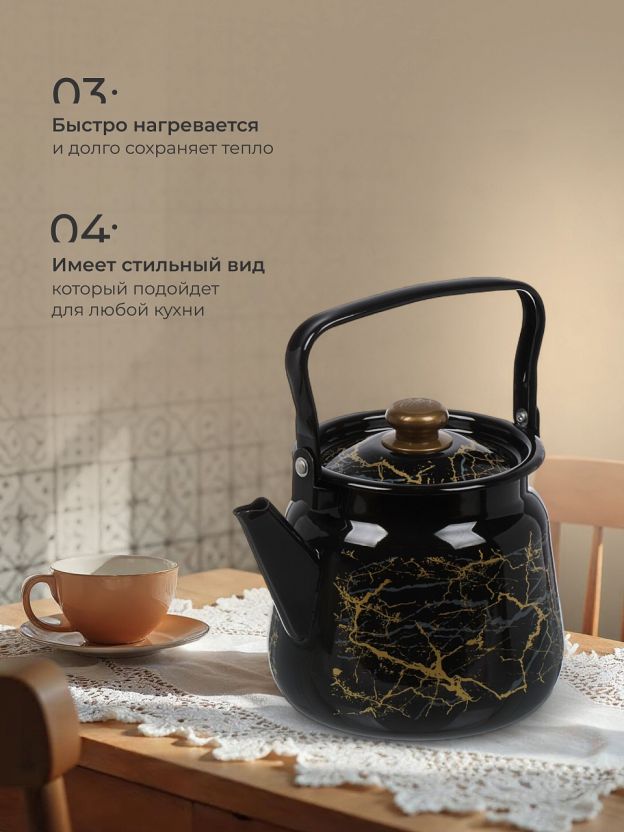Чайник стальной с эмалированным покрытием, 3.5 л — практичное решение для семьи и дачи: кнопка для легкого наливания, стиль «Мрамор золотой», цена без переплат.