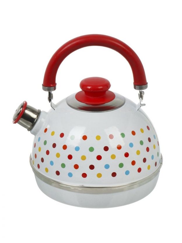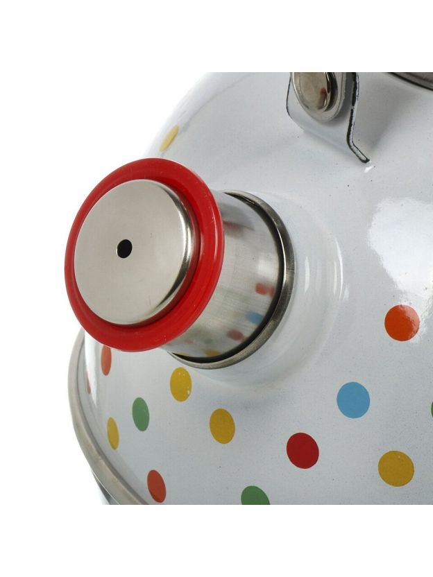 Чайник стальной с эмалированным покрытием 3.5 л Рубин «Разноцветные горохи» — недорогое решение для большой семьи, дачи и подарка. Безопасная ручка, яркий дизайн, свисток.