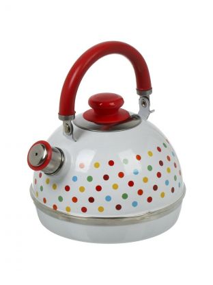 Чайник стальной эмалированный на 3,5 литра — оптимальный выбор для тех, кто ищет вместительный и недорогой чайник для дома или дачи. Эмалированное покрытие защищает сталь от коррозии и облегчает уход: налёт легко удаляется, а цвет сохраняется даже при частом использовании. Яркий белый корпус с разноцветными горошинами оживит интерьер кухни, отлично подойдёт для подарка.