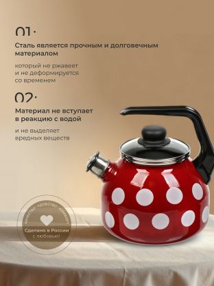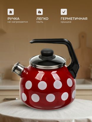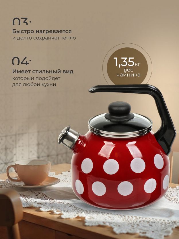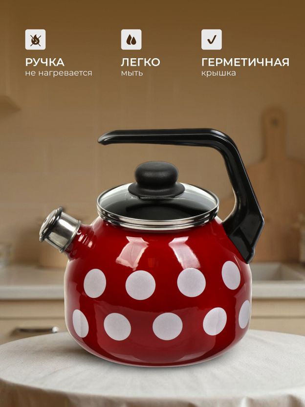 Чайник из стали с эмалированным покрытием 3 л «Вишневый белый горох» для индукции: стильная защита от накипи, эргономика и безопасность для дома и дачи.