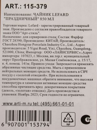 Чайник заварочный фарфор, 0.85 л, Lefard, Праздничный, 115-379
